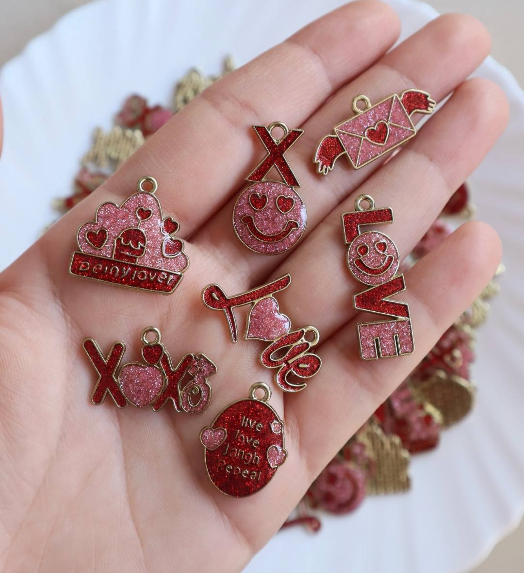 Add a touch of sparkle and love to your accessories with our Glitter Valentine Love Charms. Designed in romantic red and pink tones with adorable love, heart, smiley, and XOXO motifs, these charms are perfect for creating keychains, bracelets, necklaces, bag charms, or DIY gifts. Cute, trendy, and full of love